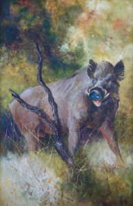 Painting by the late Don Keller of a wild boar which graces the cover of one of my latest books, POOR MAN’S GRIZZLY.