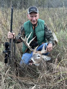 We were watching several does when a buck approached from the south. Initially, all we could see were his antlers, which were extremely massive, many points on a typical 5×5 frame. I was just about to suggest Jim consider taking the buck, when he raised his rifle. Using his vest, he created a solid rest. When the buck gave Jim a proper shot, he pulled the trigger. The buck took four steps and collapsed. A few minutes later, we walked up to Jim’s biggest whitetail ever.