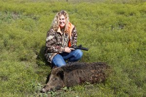 On another occasion I had been hunting with my Taurus Raging Hunter .454 Casull handgun, loaded with 240-grain XTP Hornady Custom ammo. We were sitting around the campfire telling stories when a big wild boar, walked out of the brush about a hundred yards away. I reached for my handgun, handed it to Theresa and told her to get a solid rest and shoot the boar. I had it sighted-in to be dead-on at 100-yards.